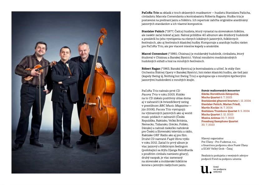 Pre Úľany – Pro Fudemus, n.o. Vás pozýva na koncert PaCoRa trio v nedeľu 10.8.2025 o 18:00 hod. v Evanjelickom kostole Pusté Úľany.